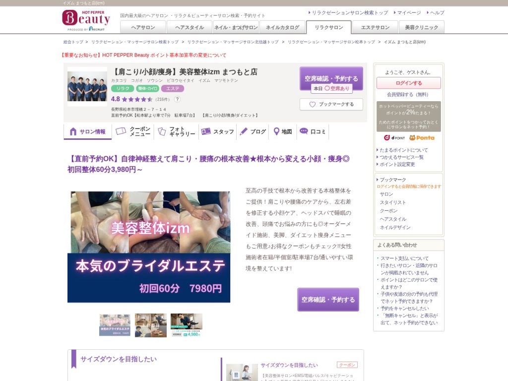 | 【肩こり/小顔/痩身】美容整体izm まつもと店 | 筋膜リリースと自律神経調整を組み合わせた独自メソッド | 慢性疲労症候群、肩こり、頭痛、自律神経失調症 |